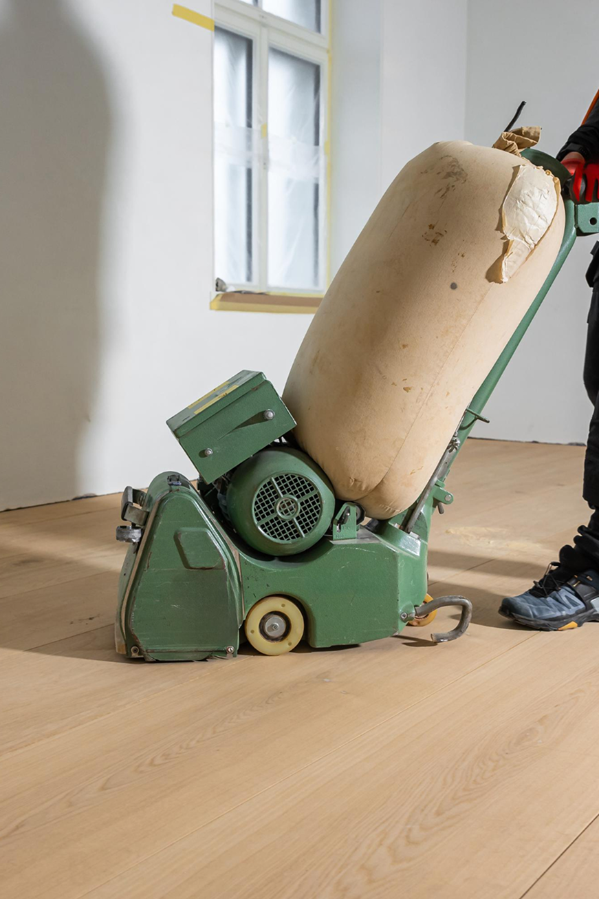 Професионално циклене на старо дюшеме с валова машина за премахване на боя и изравняване на повърхността.